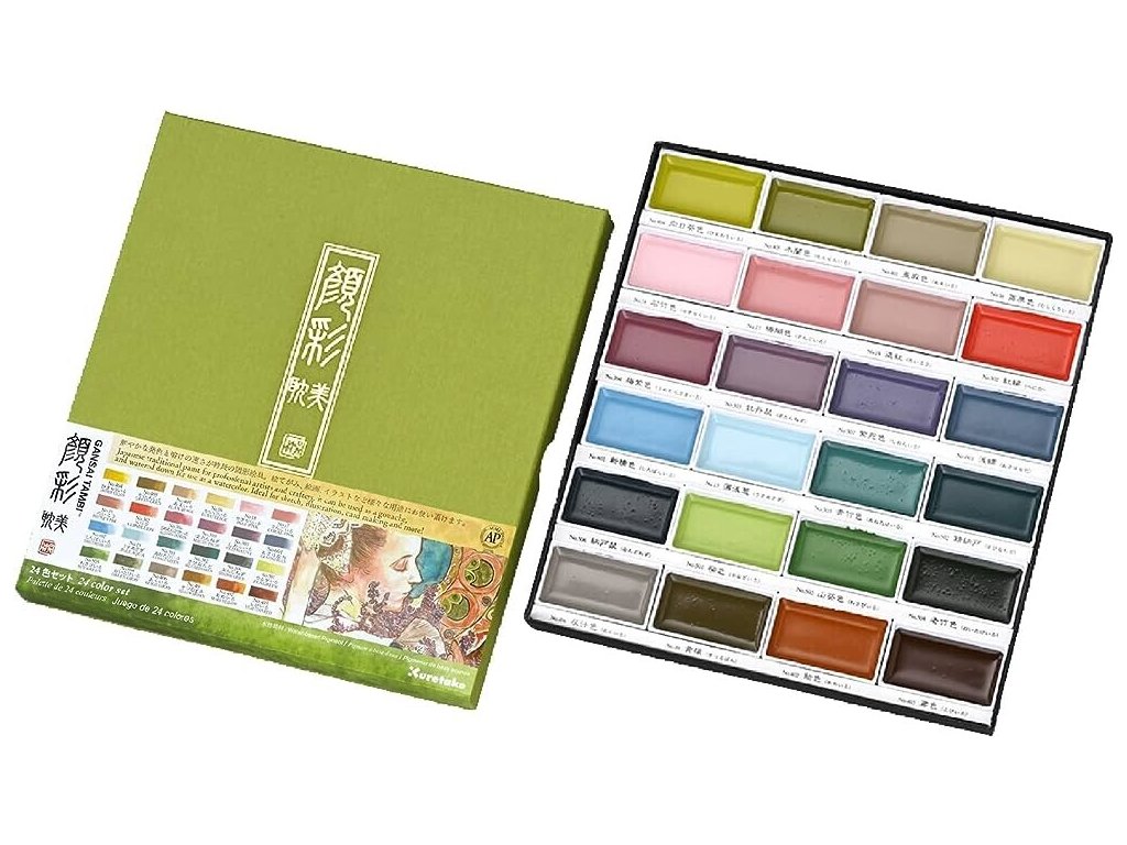 Gansai Tambi 24 ks Art Nouveau od Kuretake jsou japonské tradiční akvarelové barvy pro výtvarníky a profesionální umělce. Obsahují nádherný pigment na vodním základu. Tyto akvarelové barvy mají široké využití - skici, ilustrace, sumi-e a další.