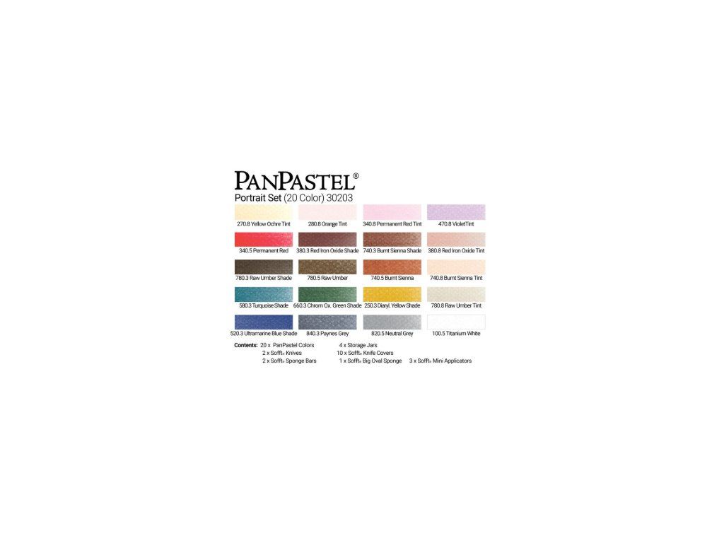 - 20 farieb PanPastel: Titanium White, Diarylide Yellow Shade, Yellow Oxide Tint, Orange Tint, Permanent Red, Permanent Red Tint, Red Iron Oxide Shade, Red Iron Oxide Tint, Violet Tint, Ultramarine Blue Shade, Turquoise Shade, Chromium Oxide Green Shade, Burnt Sienna, Burnt Sienna Shade, Burnt Sienna Tint, Raw Umber, Raw Umber Shade, Raw Umber Tint, Neutral Gray, Payne's Gray.